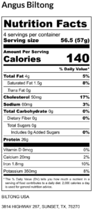 Biltong is one of the most protein-dense foods in the world, often 50–60% by weight. It provides high-quality, complete protein with all essential amino acids, supporting muscle growth, repair, and satiety. 2-ounces (56.5g) of our Angus Biltong provides up to 27g of protein, making it an excellent snack for active people, athletes, or anyone on a high-protein diet.